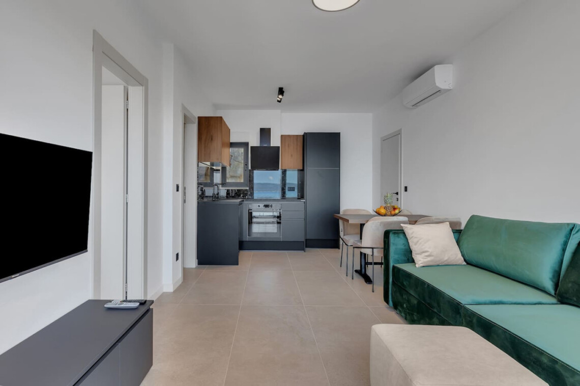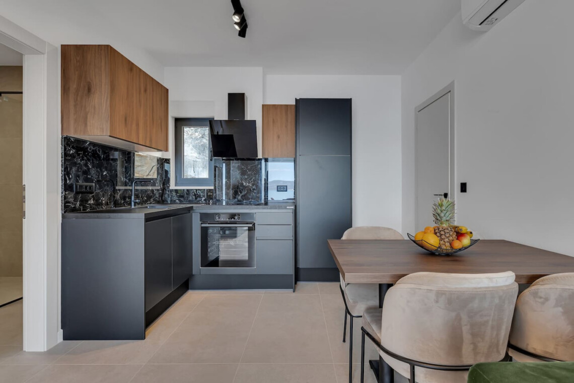Das Apartment ist mit einem komfortablen Doppelbett und einem Schlafsofa ausgestattet und bietet Platz für zwei Erwachsene und zwei Kinder. Die moderne Einrichtung, eine voll ausgestattete Küche und helle Wohnbereiche sorgen für eine angenehme und gemütliche Atmosphäre.